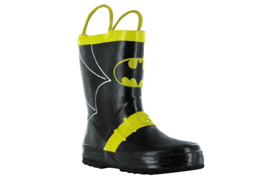 Rain boots have to make a statement if you're going to get a young boy to wear them. These Batman leather rain boots make just such a statement. The cool batwing graphic on the back of the boot coupled with the trademark Batman yellow trim will make him the envy of his friends. The deep tread on the bottom of the boot will provide stability in wet and slippery conditions. The tough, ample stirrups will make the boots easy to tug on over shoes.